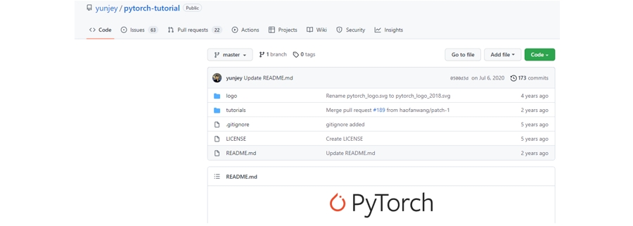 적당한 위치에 PythonProgramming이라는 폴더를 만들고, 해당 폴더로 들어가서 저장소의 파일을 복제해온다. 여기서는 https://github.com/yunjey/pytorch-tutorial에 있는 실습파일을 가져왔다.