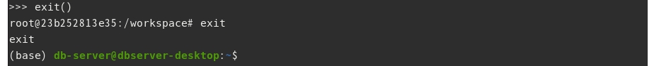 exit()를 입력하여 파이썬을 종료하고, shell에서 exit를 입력하여 컨테이너를 정지하자. 리눅스 터미널로 돌아올 것이다.