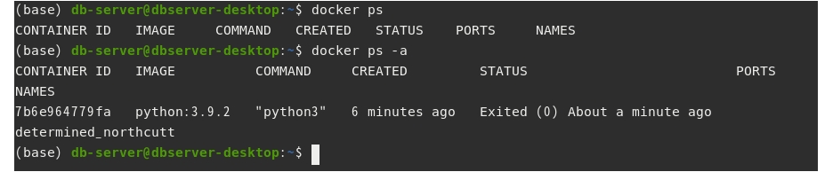 앞에서 실행했던 python:3.9.2 이미지로 만든 컨테이너는 보이지 않는다. docker ps 명령은 실행 중인 컨테이너 리스트만 출력하기 때문이다. 정지된 컨테이너도 출력하려면 -a 옵션을 사용하면 된다.