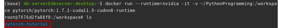 $ docker run --runtime=nvidia -it -v ~/PythonProgramming:/workspace pytorch/pytorch:1.7.1-cuda11.0-cudnn8-runtime