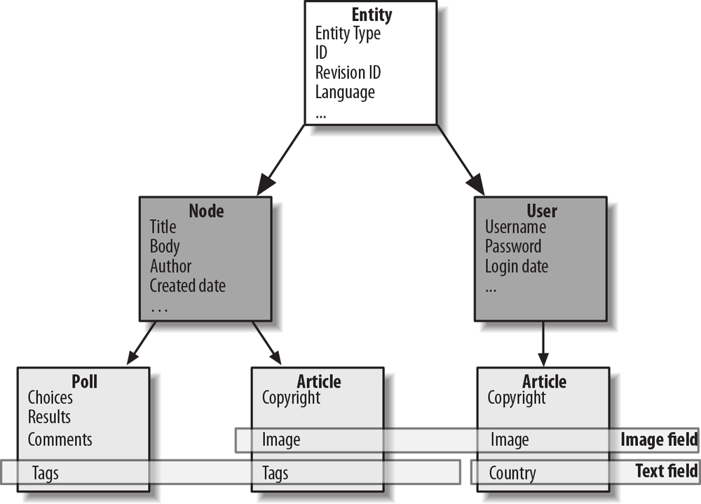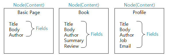 그림과 같이 컨텐츠는 새로운 컨텐츠 타입을 자유로이 만들 수 있으며 컨텐츠 노드는 필드를 가지게 된다.