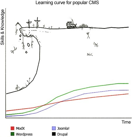 도입하기 전 각 프레임워크의 비교에서 발견한 그림인데 얼마나 어려우면 곡선을 이렇게 그려놨나 하고 Drupal을 도입하는 것에 대해 잠깐 생각했으나 CMS계의 리눅스라는 말이 왠지 도전의식을 자극해 시작하게 되었다. 왠지 이 프레임워크에 대한 자료나 사이트가 한국에는 거의 없다시피 하고 주로 외국에 많다는 것도 알게 되었다. 물론 지금 생각해 보면 꽤 어렵긴 했다. 따라서 좀 정리해 보도록 한다.