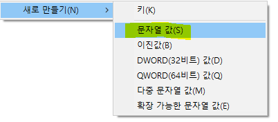 오른쪽 마우스 클릭 > 새로 만들기 > 문장려 값