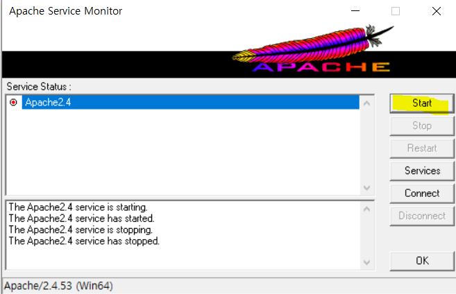 Apache24 폴더 > bin 폴더 > ApacheMonitor.exe 실행