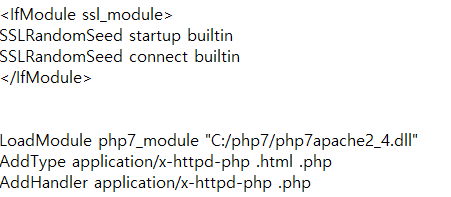 LoadModule php7_module "C:/php7/php7apache2_4.dll" AddType application/x-httpd-php .html .php AddHandler application/x-httpd-php .php 세 줄 추가해주기Apache24>htdocs 폴더에 phpinfo.php 파일 추가하고
