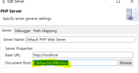 PHP > Servers > Default누르고 Edit 버튼 클릭