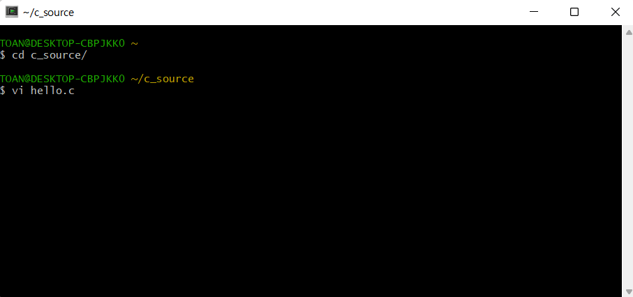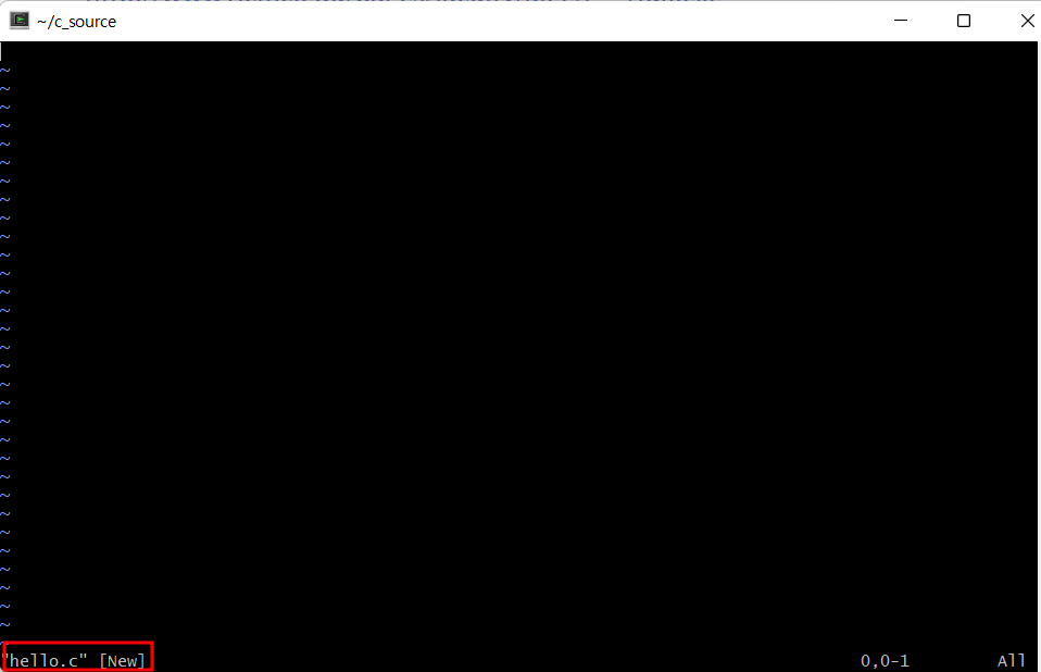 c_source 폴더로 진입한 후 (cd c_source) vi hello.c를 통해 vi에디터를 실행 시킨다.