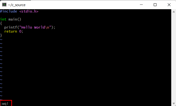 - 입력모드에서 소스코드를 입력 하고 (:)콜론을 눌러서 "wq!"일 입력한 후 엔터.