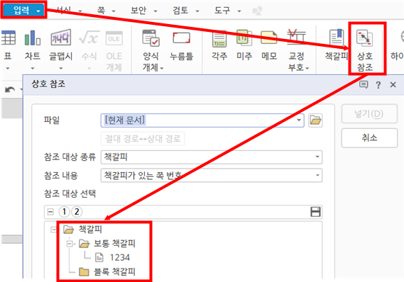 * 입력 > 상호참조 > 책갈피에서 구역내 마지막 페이지의 책갈피 선택