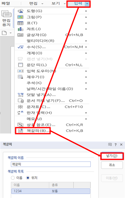 * 구역내 마지막 페이지에 커서 두기 > 입력 > 책갈피 > ‘넣기’