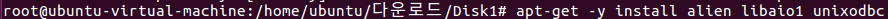 9. 폴더로 들어가신뒤 apt-get -y install alien libaio1 unixodbc를 입력하셔서 alien libaio1 unixodbc를 다운로드 해주세요