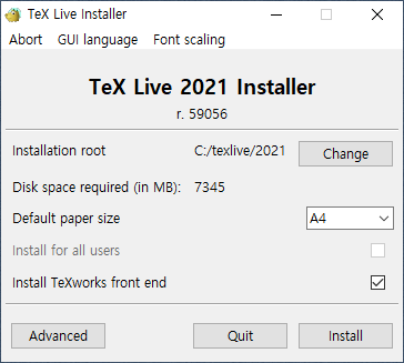 - Install을 누르면 나오는 Tex Live Installer 창에서 Advanced 를 클릭