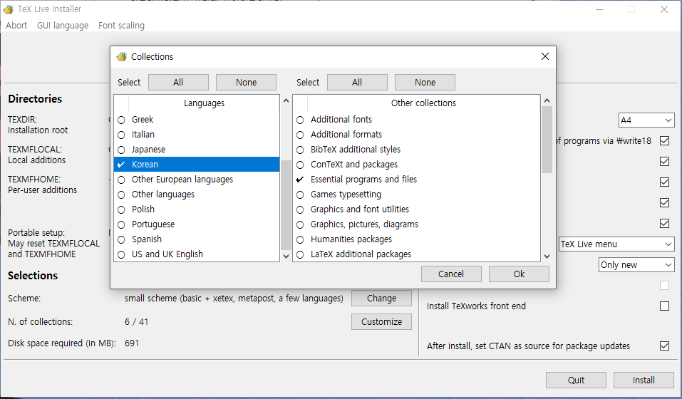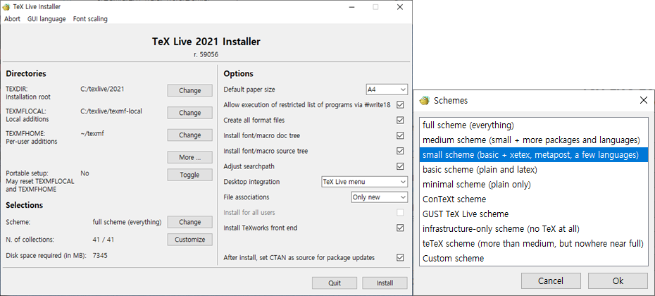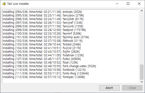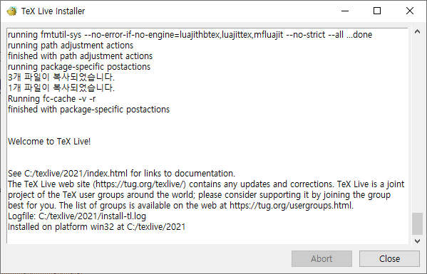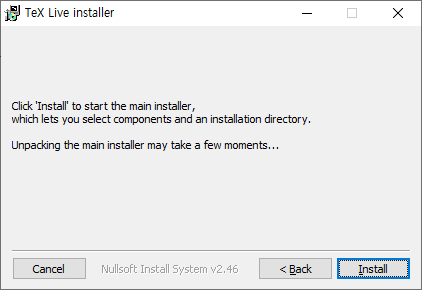 - TexLive 페이지(http://tug.org/texlive/acquire-netinstall.html)에서 윈도우용 설치파일(install-tl-windows.exe)를 다운로드 및 실행