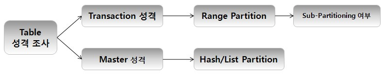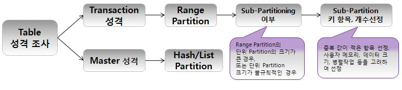 - 업무적 특성에 따른 Partition 기준(Partition Key, Partitioning 방법)을 고려 하여