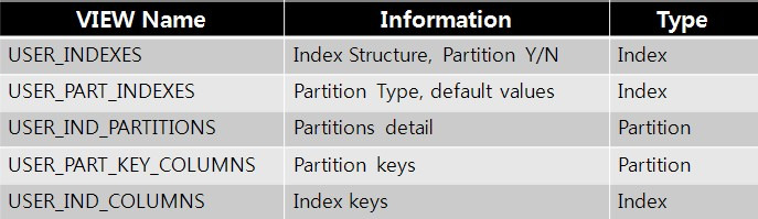 - Partition Table에 DDL작업을 수행한 후에는 Table에 있는 Index(Local/Global)에 Rebuild 작업을 수행해 주어야 한다.