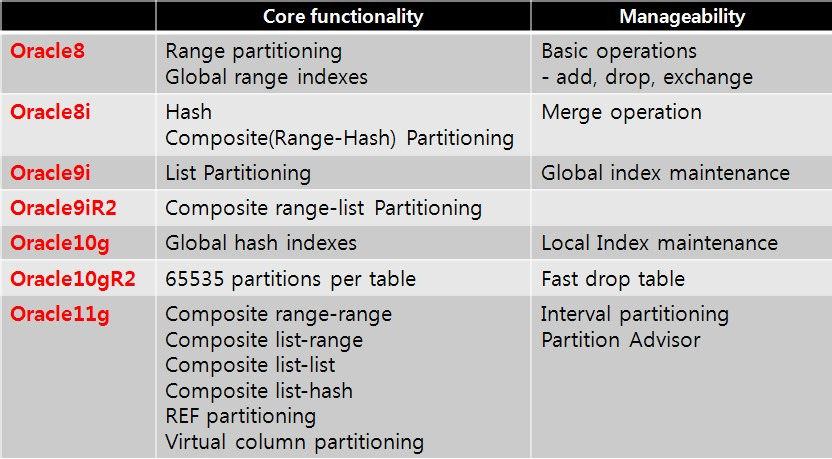 2.1. 오라클 버전별 지원되는 파티셔닝 기법