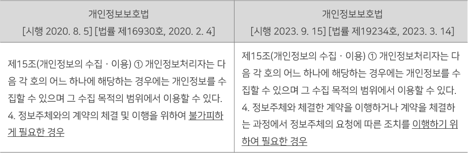 개인정보보호법 제15조는 개인정보처리자가 정보주체의 개인정보를 수집할 수 있는 개인정보의 수집ㆍ이용에 대한 내용이다. 그중 제1항 4호는 개인정보처리자가 서비스를 제공하는 데 반드시 필요한 정보주체의 개인정보, 즉 ‘개인정보 필수 항목’ 수집에 관한 규정이다. 개정 전 조문에는 서비스를 제공하는 데 그 개인정보를 수집하는 것 이외에 다른 방법이 없다는 걸 개인정보처리자가 입증하라는 의미의 ‘불가피하게’가 있어서 이 조항이 사문화됐는데, 이번 개정에서 ‘불가피하게’가 삭제되었다.