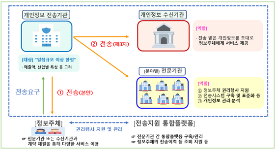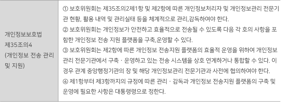 정보주체의 개인정보 관리·통제권을 강화하기 위해 본인에 관한 개인정보를 본인 또는 제3자(개인정보처리자 또는 개인정보관리 전문기관)에게 전송할 것을 요구할 수 있는 권리인 “개인정보 전송요구권”을 도입했다. 전송요구권에 따라 개인정보를 제공해야 하는 개인정보처리자의 범위, 정보를 수신하는 자가 충족하여야 하는 시설 및 기술 기준 등은 시행령으로 정해질 예정이다. 한편, “개인정보관리 전문기관”을 도입하여, 개인정보 보호위원회 또는 관계 중앙 행정기관의 장으로부터 지정을 받은 개인정보관리 전문기관은 정보주체의 전송 요구권 행사를 지원하기 위한 개인정보의 관리·분석 등의 업무를 수행하도록 했다.