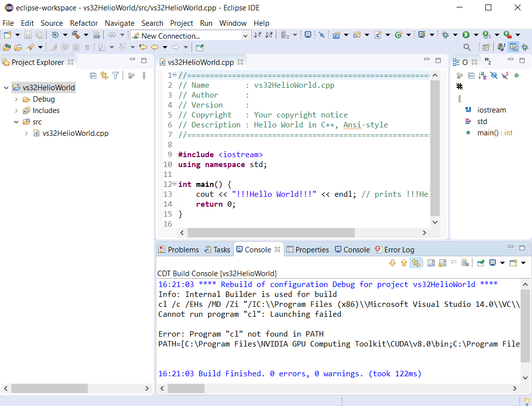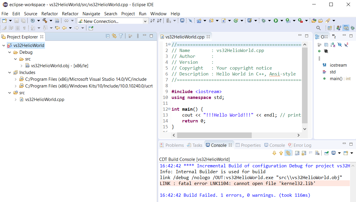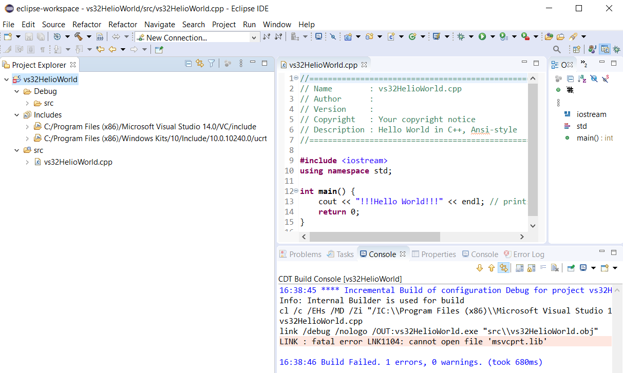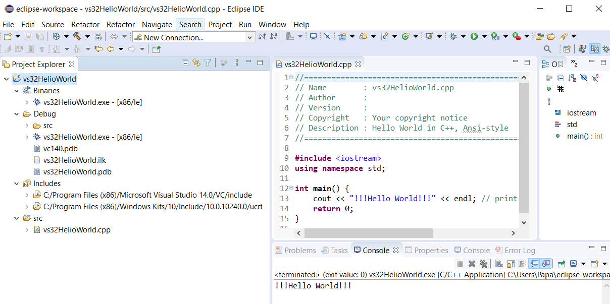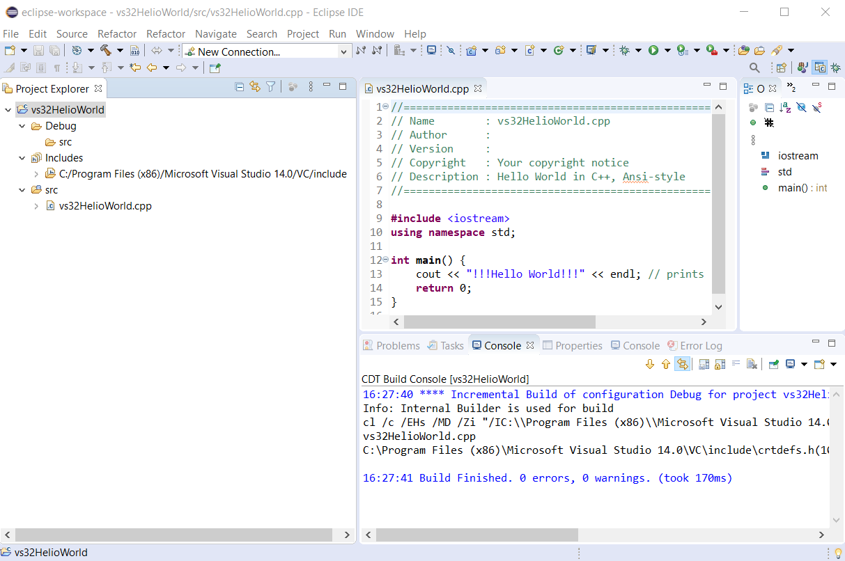 - The C++ 32-bit HelloWorld project with Microsoft Visual C++ toolchain in Eclipse IDE