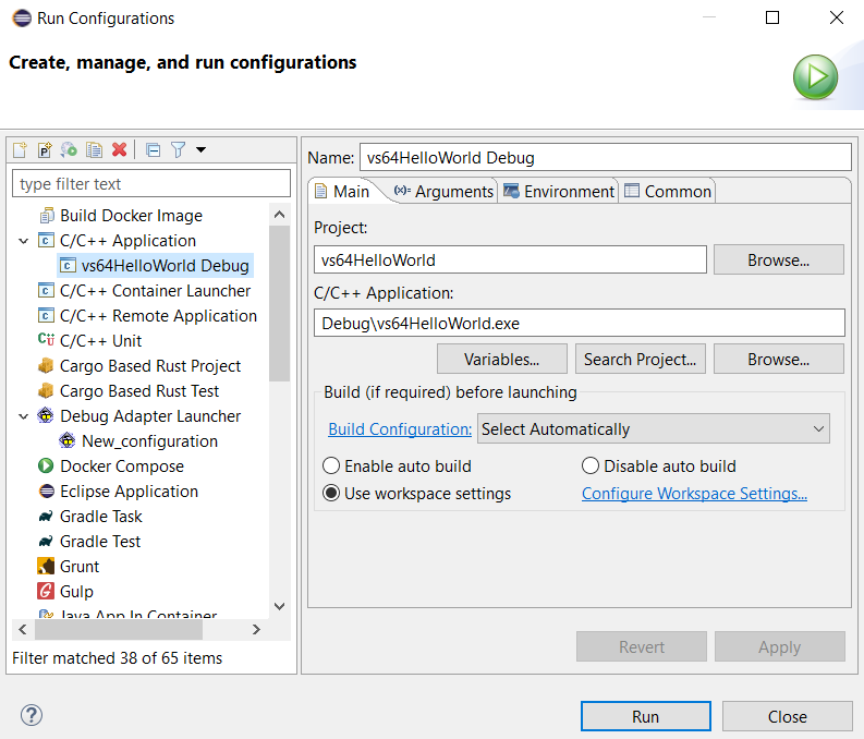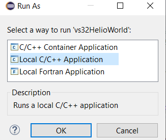 Click C/C++ Application then vs64HelloWorld Debug.Click Run button.