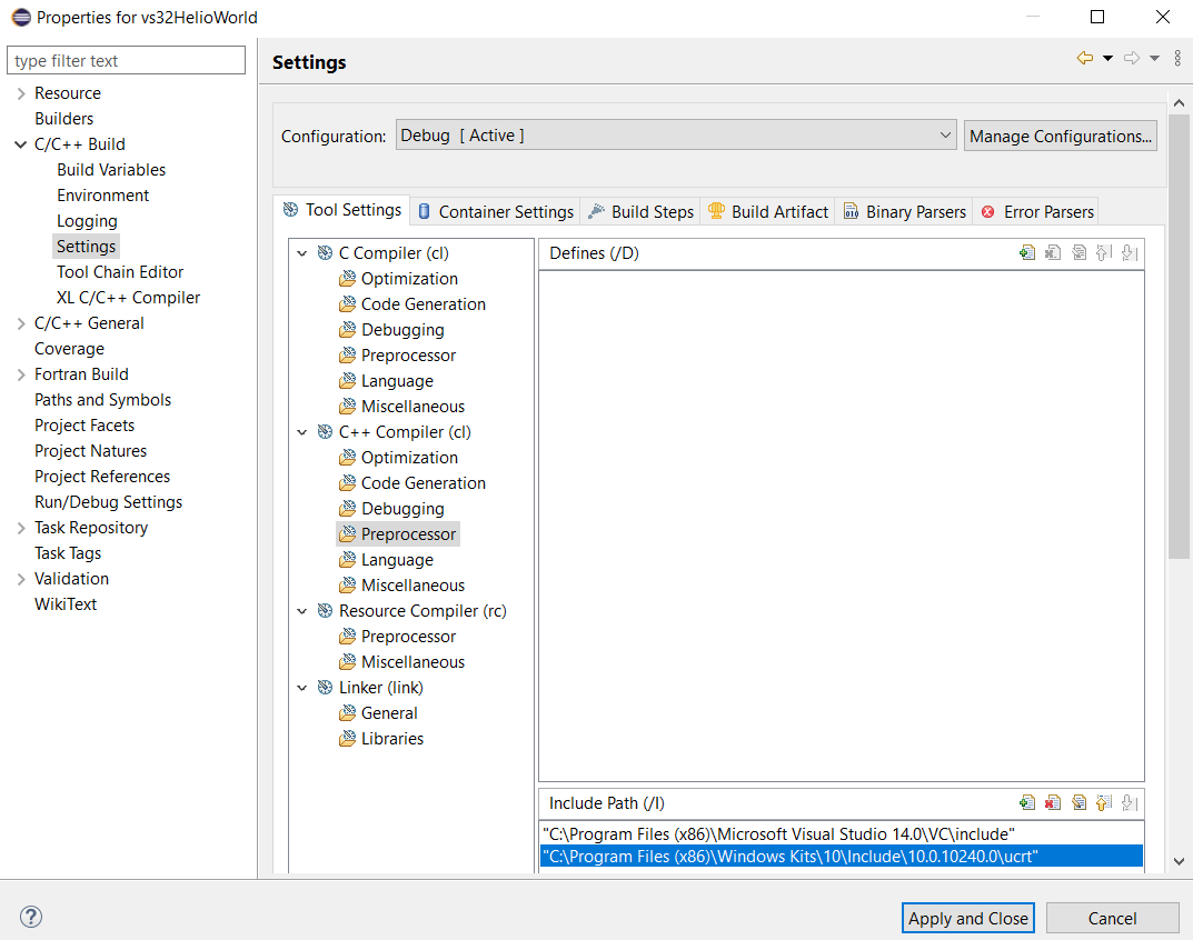 Provide the path C:\Program Files (x86)\Windows Kits\10\Include\10.0.10240.0\ucrtClick Apply button, then Apply and Close button.