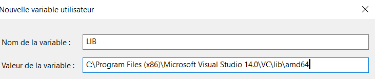 Provide C:\Program Files (x86)\Microsoft Visual Studio 14.0\VC\lib\amd64; for Variable value.Click OK button.