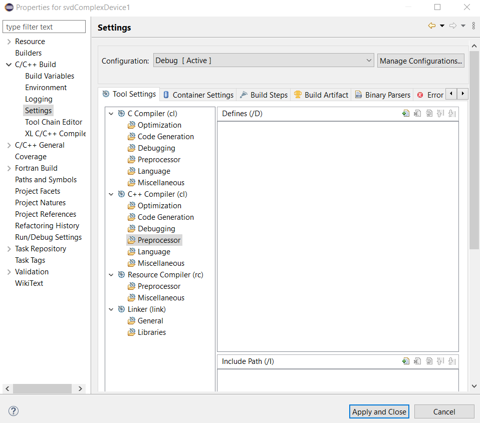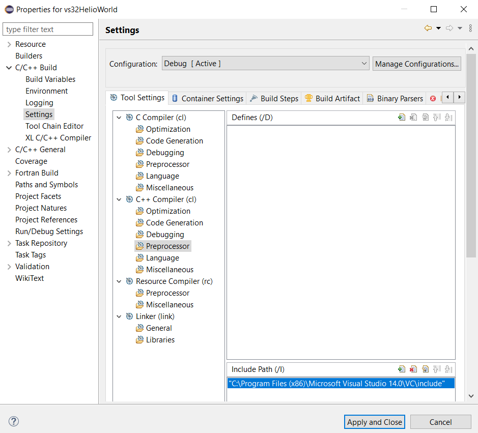 Click C/C++ Build then Settings. Click Preprocessor for C++ Compiler (cl) in Tool Settings tab.
