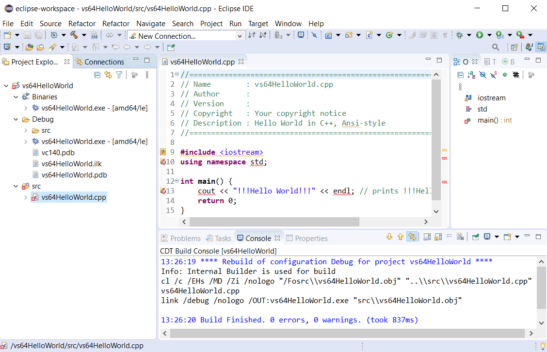 - The C++ 64-bit HelloWorld project with Microsoft Visual C++ toolchain in Eclipse IDE
