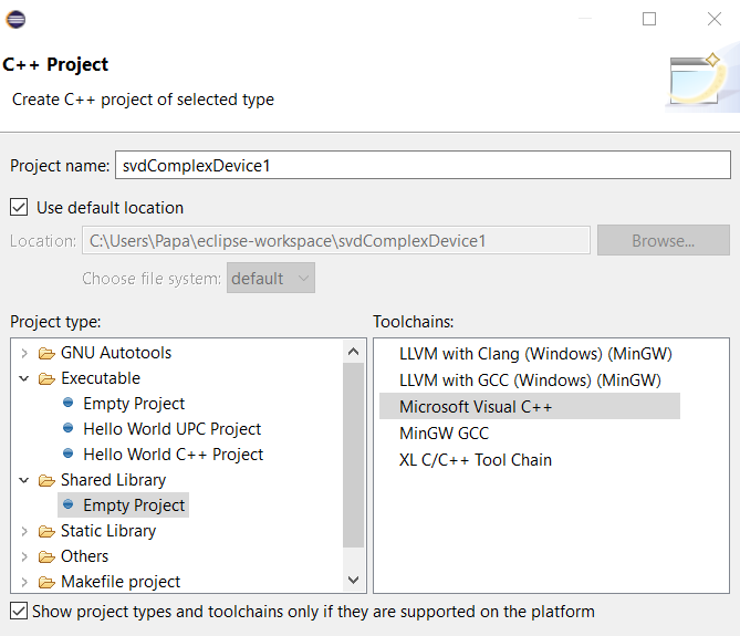 C++ 64-bit shared library svdComplexDEvice1.dll project with Microsoft Visual C++ toolchain in Eclipse IDE