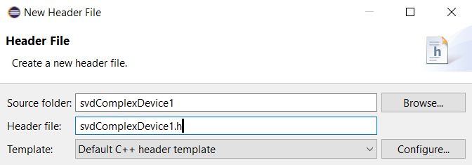 Provide the name for Header file: svdComplexDevice1.h.Click Finish button.