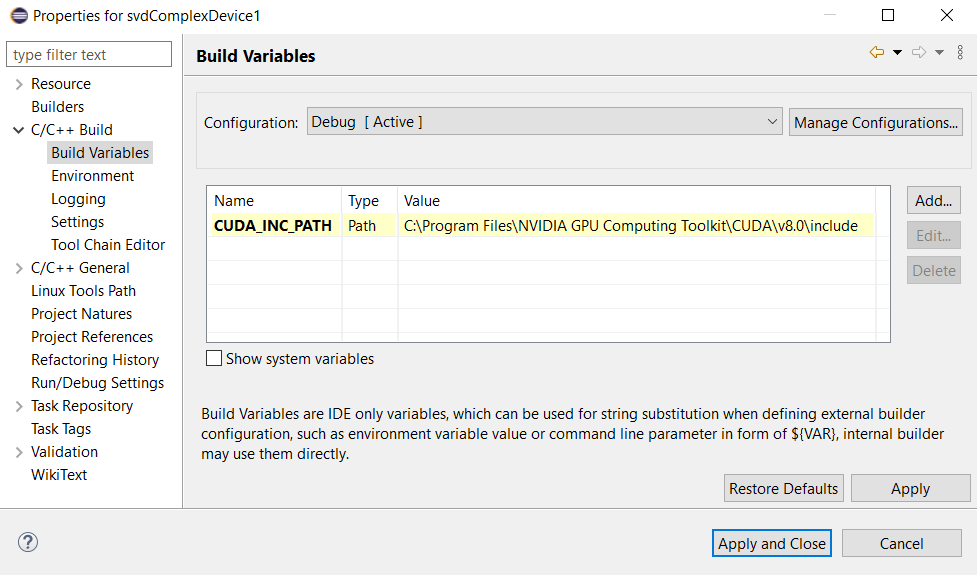 Click C/C++ Build then Build Variables.Click Add... button.