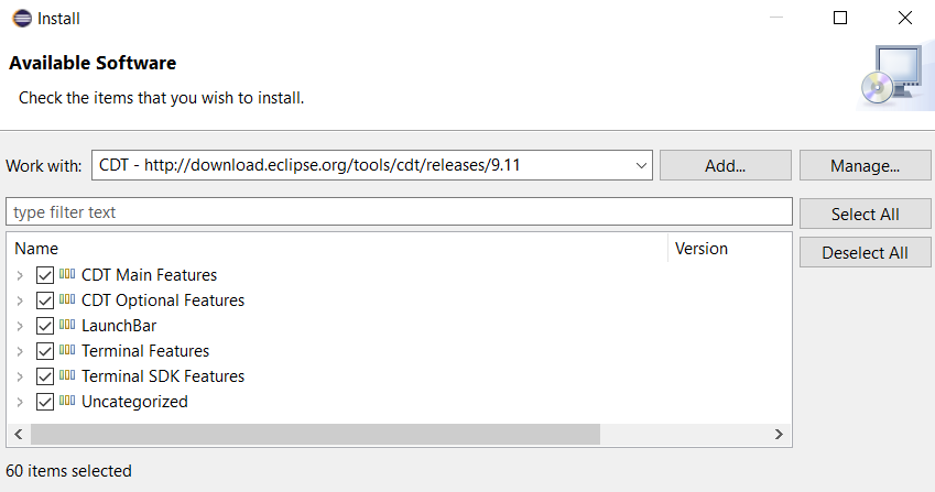 - In Work with, select CDT - http://download-eclipse.org/tools/cdt/releases/9.11.