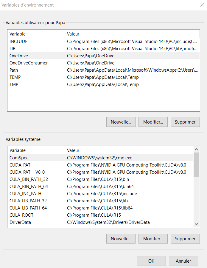 - The User environment variables in Windows 10