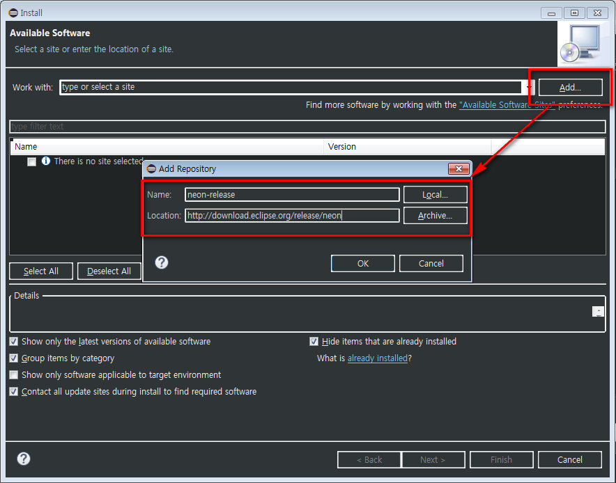이클립스에 마이크로소프트 사의 환경을 설정하기 위해서는 하나를다운받아서 설치 해야 한다. Install New Software를 선택하고 나서