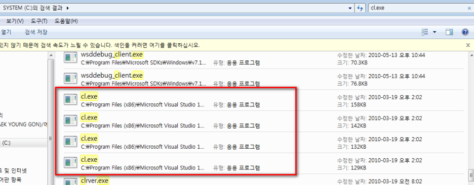 그리고 이 설정이 끝나고 코드를 작성하기에 앞서 사전작업이 필요하다. 우선, 윈도우 컴파일러인 cl.exe 파일이 어디에 존재하는 지 알 필요가있다. 뭐 그럼 윈도우 검색으로 찾아 보자