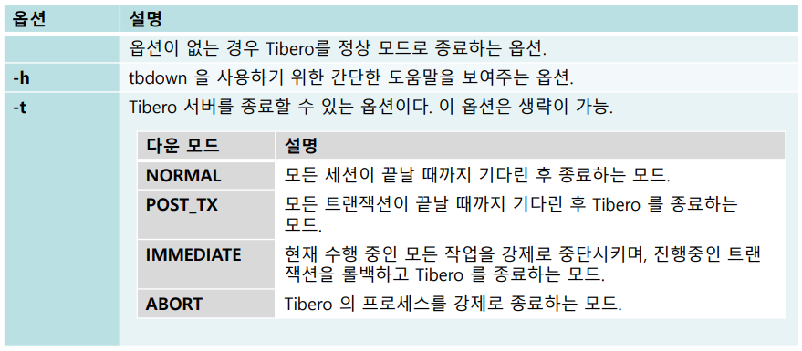 - 만약 Tibero 서버가 Kill 과 같은 시스템 내부 명령어에 의해서 비정상적으로 종료된 경우, 운영 중에 사용하였던 공유 메모리나 세마포어 자원들이 해제가 않될 수 있다. 이런 경우 Tibero 가 정상적으로 재 기동 하지않게 되므로, tbdown clean 으로 기존 자원을 해제시킨 후 tbboot 를 실행.