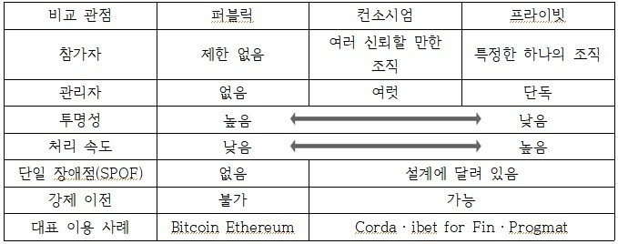 퍼블릭 블록체인이란 비트코인으로 대표되는, 누구나 접근할 수 있는 네트워크를 가리킨다. 컨소시엄ㆍ프라이빗 체인은 한정된 특정한 관계자의 접근만을 허용하는 네트워크다. 금융 거래에서 이용되는 시스템에서 거래와 관련 없는 사용자에게 데이터를 공개하는 이용 방식이 존재하지 않기 때문에 컨소시엄ㆍ프라이빗형이 이용되는 경향이 있다.