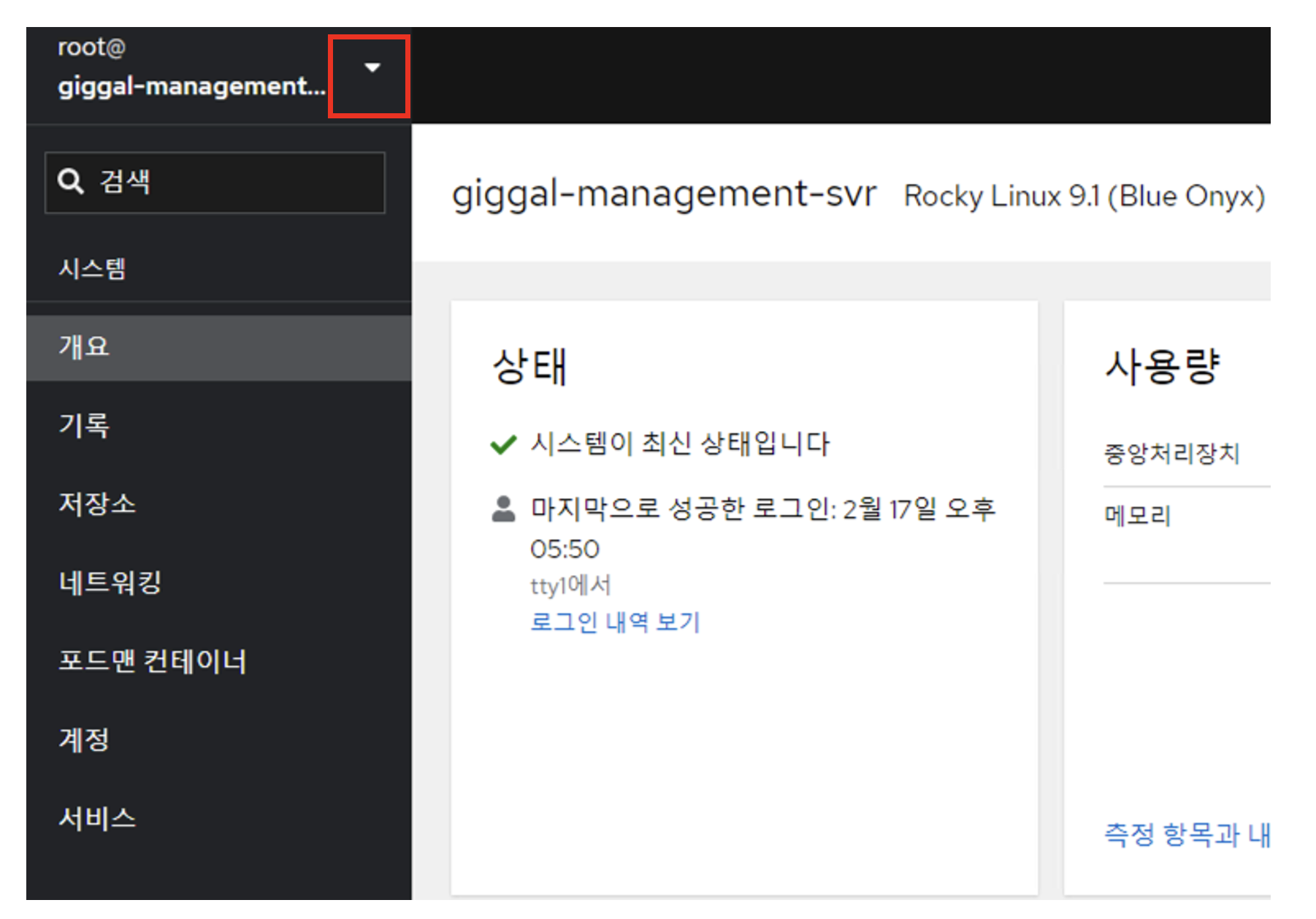 최초 cockpit에 접속한 뒤 왼쪽 윗부분에 위 사진과 같이 화살표를 눌러줄게요.