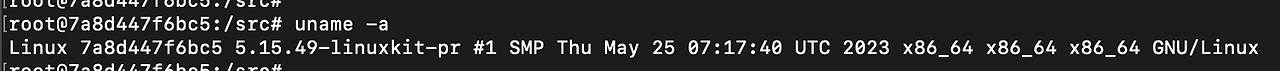 > Linux 7a8d447f6bc5 5.15.49-linuxkit-pr #1 SMP Thu May 25 07:17:40 UTC 2023 x86_64 x86_64 x86_64 GNU/Linux