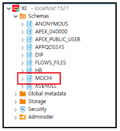 즉 현재 접속해 있는 계정은 'SYSTEM'인데 MOCHI라는 사용자가 소유하고 있는 MOCHI스키마에