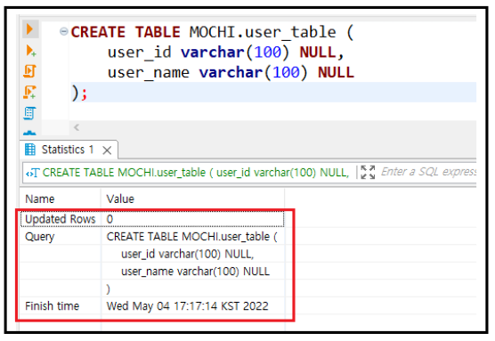 이렇게 MOCHI라는 스키마가 생성 된 것을 알 수 있다. 이제 이 MOCHI라는 스키마에 테이블을 생성해보자.