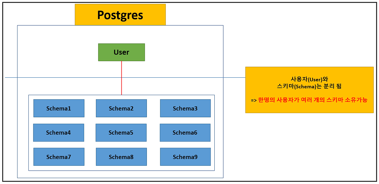 이런 느낌이다.. 그래서 보통 Postgres를 사용할 때는 필요한 스키마를 생성해서 스키마에 테이블 만들고