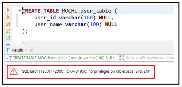 MOCHI 사용자로 로그인하니, 그제서야 MOCHI 스키마에 테이블을 생성 할 수 있었다.