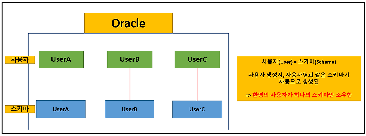 - 하나의 사용자 계정은 하나의 스키마를 가지며, 이 스키마 내에서 다양한 객체를 생성하고 관리할 수 있습니다.