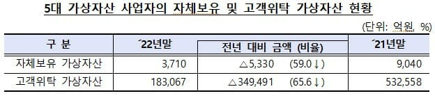 원화마켓을 운영하는 가상자산 거래소인 업비트, 빗썸, 코인원, 코빗, 고팍스의 가상자산 보유 현황도 공개했다. 5개 사업자가 자체 보유한 가상자산은 지난해 말 기준 총 3천710억원으로 전년 대비 59%, 5천330억원 가량 감소했다.