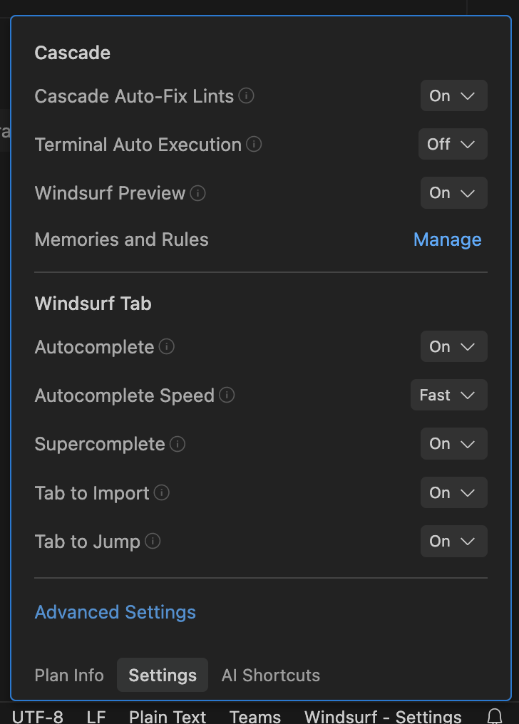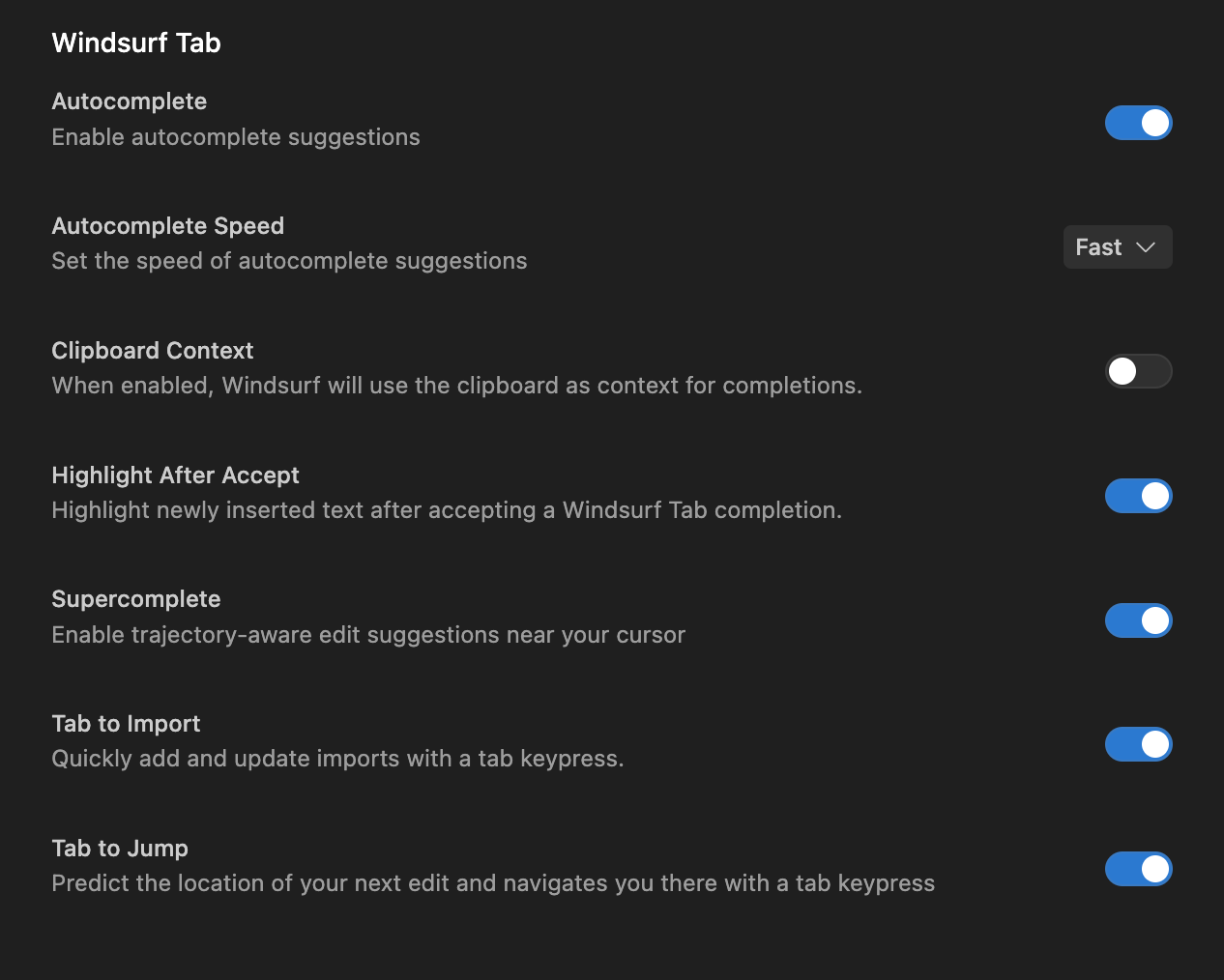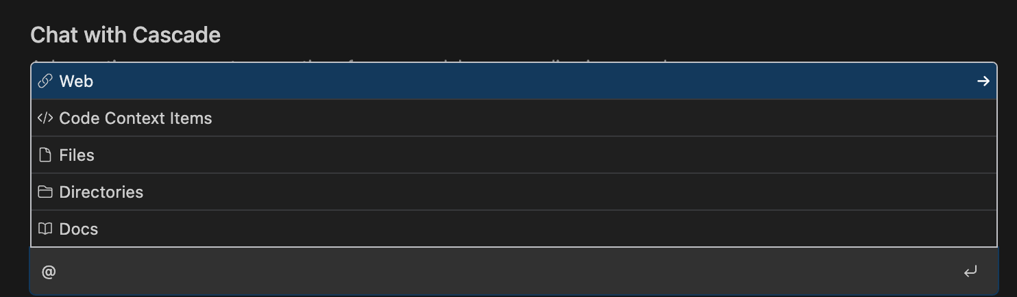 - WindsurfTab: 전체 코드 블록을 생성하는 지능형 코드 완성 도구 (editor 내에서 tab)