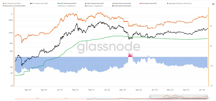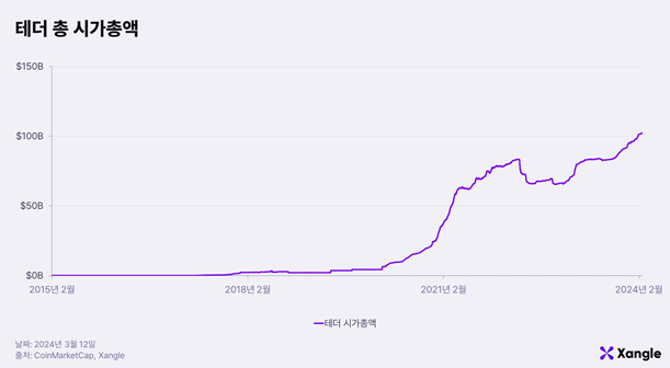 크립토 투자자들이 스테이블코인의 안정성을 원한다는 건 시가총액에서도 드러난다. 크립토 시가총액 순위에서 스테이블코인인 USDT가 3위, USDC가 7위에 자리해있다. 또한 전체 스테이블코인의 점유율은 약 17%를 차지한다. (2024.2.29 기준) 이제는 스테이블코인 자체를 달러 화폐와 같다고 생각하는 탓에 투자를 하지 않을 때는 당연히 스테이블코인을 가지고 있어야 한다고 생각한다. 하지만 스테이블코인이 명목화폐와 같지 않으며 수많은 코인 중 하나라고 본다면, 가격이 안정적인 코인에 대한 사람들의 니즈가 얼마나 높은지 깨달을 수 있다.