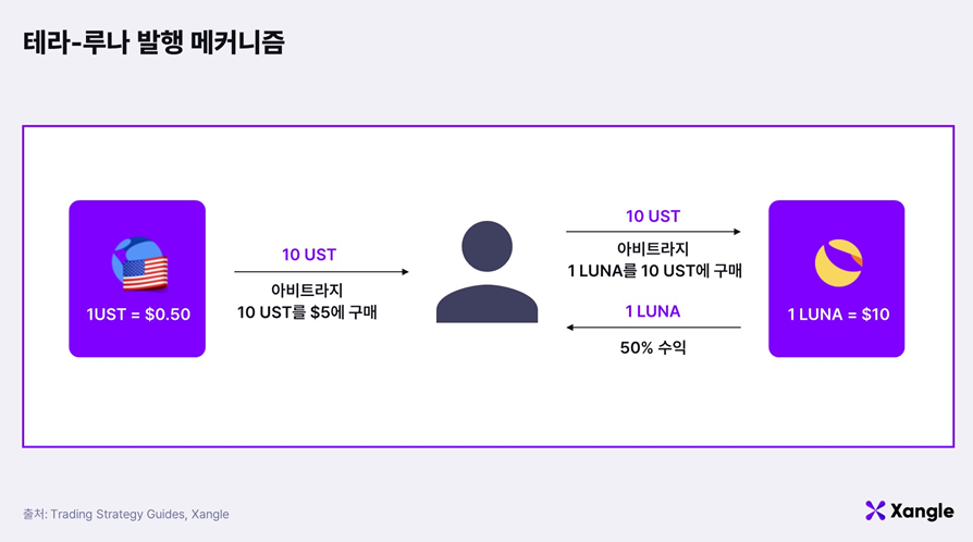 테라의 스테이블코인 UST는 LUNA라는 토큰과 함께 작동한다. ‘테라스테이션’이라는 일종의 교환소에서 테라와 루나를 서로 교환할 수 있다. UST는 1달러에 페깅되는 스테이블코인이고 루나는 이를 보조하는 목적으로 발행된 일반적인 토큰이다.