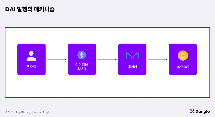 DAI 스테이블코인 발행의 핵심은 과담보다. 현재 최소 담보비율은 150%다. DAI 발행사인 메이커다오가 만든 일종의 금고인 볼트에 150달러의 이더리움을 예치한다. 그러면 100달러 만큼의 DAI를 받는다. 다시 100달러의 DAI를 돌려주면, 내가 맡겼던 150달러어치의 이더리움을 다시 돌려 받는다.