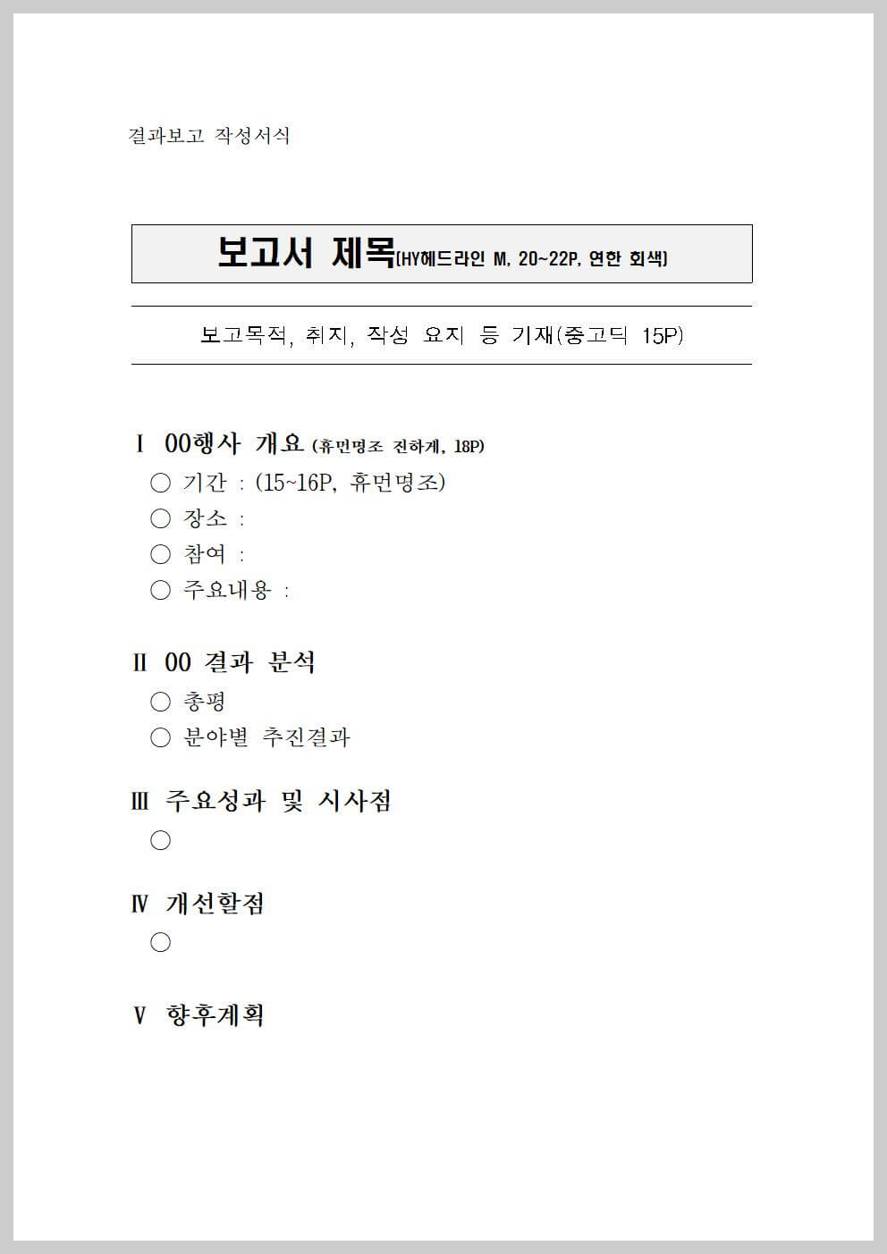 작성기관별 사용하는 서식이 모두 다르기 때문에 자체 보고를 위한 표준서식을 참고하여 작성하는 것이 좋습니다. 표지의 제목, 작성일자, 쪽수, 글씨체, 크기 등 본문의 표준 규격을 적용하고 보고서가 한눈에 들어올 수 있도록 체계적으로 내용을 전개하기 바랍니다.